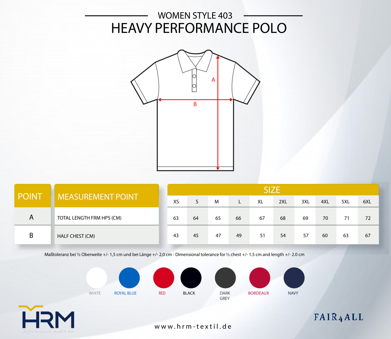 Unsere HRM Women's Heavy Performance Poloshirts bestehen aus einem besonders robusten, ringgesponnenen, feinmaschigen Piqué aus 65 % Baumwolle 35 % Polyester. Sie haben einen figurbetonten, modischen Schnitt und ein verstärktes Nackenband sowie Kragen- und Ärmelabschlüsse aus 1x1-Rippstrick. Die Ton-in-Ton-3-Knopfleiste mit HRM-Details verleiht den Heavy Performance Poloshirts eine edle Optik bis ins Detail. Die verstärkten Seitenschlitze und das Schulter-zu-Schulter-Nackenband sorgen für einen tollen Tragekomfort und eine lange Haltbarkeit. Die Performance-Poloshirts sind, bis auf das gewebte Fair4All Flag-Label in der linken Seitennaht, etikettenfrei. Durch die Anti-Schrumpf- und Anti-Pilling-Vorbehandlung sind sie bis zu 60°C waschbar und auch bei hohen und regelmäßigen Waschzyklen besonders pflegeleicht. Der Polyesteranteil im Material erhöht den Tragekomfort und sorgt für die perfekte Passform. Sie eignen sich besonders für eine Vielzahl von Arbeitskleidungsanwendungen.
