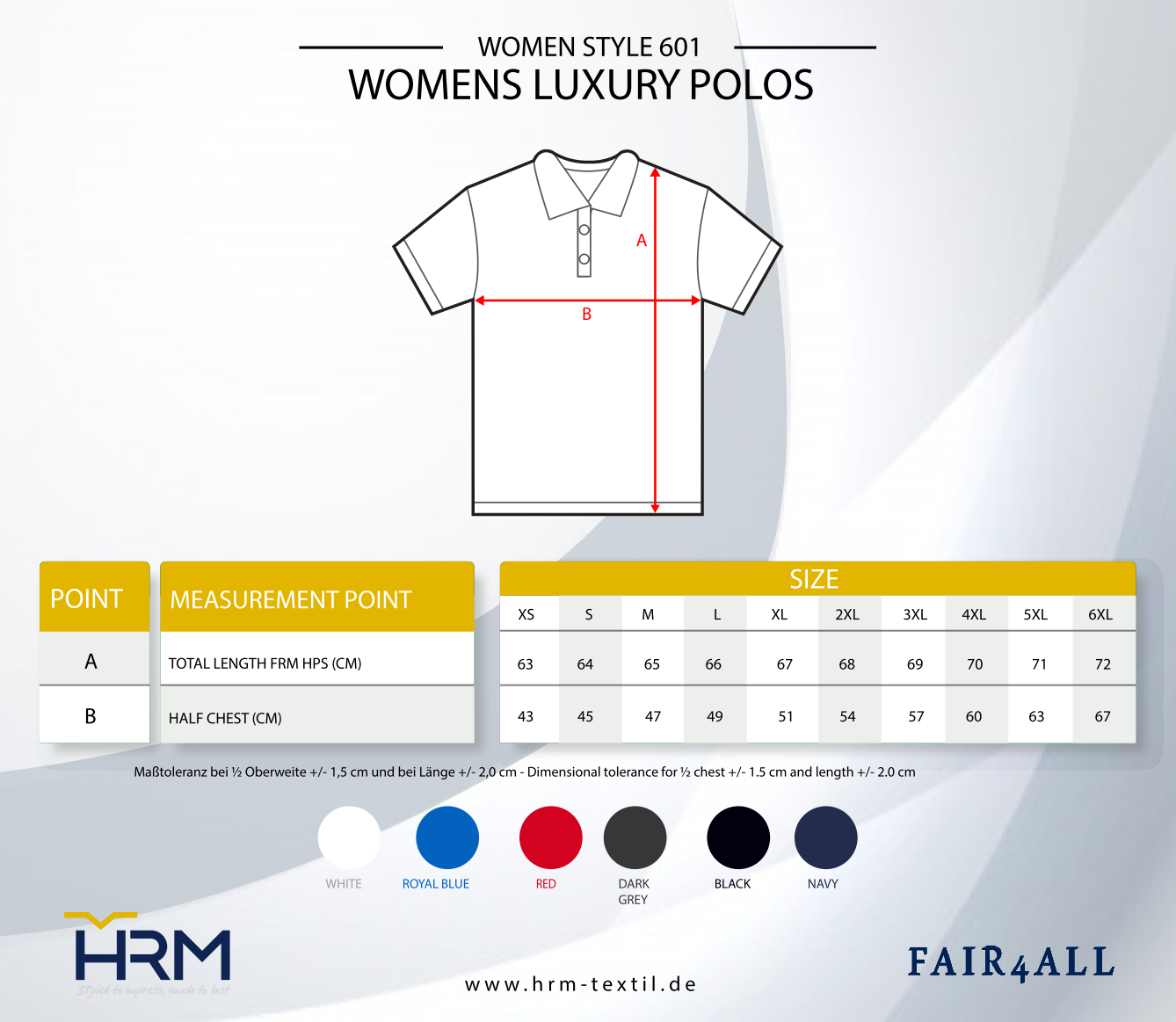 Unsere HRM Damen-Luxus-Poloshirts mit der innovativen Kragenverarbeitung bestehen aus ringgesponnenem, feinmaschigem Piqué aus 100 % Baumwolle und haben einen modischen, figurbetonten Schnitt mit einer Ton-in-Ton-3-Knopfleiste mit HRM-Details. Twillbandverstärkte Seitenschlitze und das Twill-Nackenband sorgen für einen tollen Tragekomfort und eine lange Haltbarkeit. Sie sind bis 60°C waschbar und durch die Anti-Schrumpf- und Anti-Pilling-Vorbehandlung auch bei hohen und regelmäßigen Waschzyklen besonders pflegeleicht. Unsere Luxus-Poloshirts aus Baumwolle sind etikettenfrei, bis auf das gewebte Fair4All-Flag-Label in der linken Seitennaht.