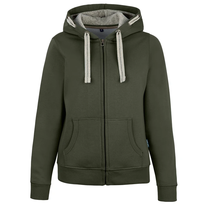 Die HRM Damen-Kapuzenjacken bestehen aus einer auffallend weichen Mischung aus 80 % Baumwolle und 20 % Polyester. Die speziell gestalteten Details wie die Kapuze mit Kontrastfutter, 3 HRM Metallösen auf jeder Seite, die mittig bestickte, flache Kontrastkordel und ein Ton-in-Ton-Reißverschluss mit HRM-Metallschieber sind ein echter Hingucker. Die Taschen sowie die Taille haben als Abschluss einen 2x2 Rippstrick. Ein verstärktes farblich passendes Nackenband erhöht den Tragekomfort. Die sehr glatte Oberflächenstruktur garantiert eine gute Finishfähigkeit. Die Kapuzenjacken sind, bis auf das gewebte Fair4All Flag-Label in der linken Seitennaht, etikettenfrei. Sie sind bei kaltem und windigem Wetter sehr universell einsetzbar.
