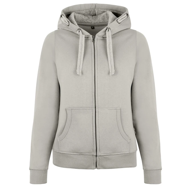 Die HRM Damen-Kapuzenjacken bestehen aus einer auffallend weichen Mischung aus 80 % Baumwolle und 20 % Polyester. Die speziell gestalteten Details wie die Kapuze mit Kontrastfutter, 3 HRM Metallösen auf jeder Seite, die mittig bestickte, flache Kontrastkordel und ein Ton-in-Ton-Reißverschluss mit HRM-Metallschieber sind ein echter Hingucker. Die Taschen sowie die Taille haben als Abschluss einen 2x2 Rippstrick. Ein verstärktes farblich passendes Nackenband erhöht den Tragekomfort. Die sehr glatte Oberflächenstruktur garantiert eine gute Finishfähigkeit. Die Kapuzenjacken sind, bis auf das gewebte Fair4All Flag-Label in der linken Seitennaht, etikettenfrei. Sie sind bei kaltem und windigem Wetter sehr universell einsetzbar.