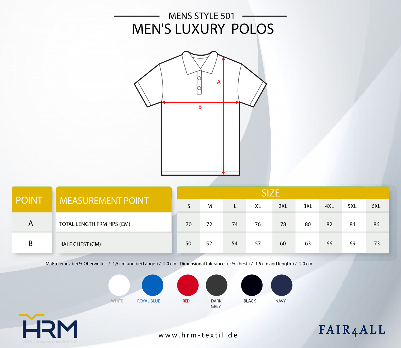 Unsere HRM Herren-Luxus-Poloshirts mit der innovativen Kragenverarbeitung bestehen aus ringgesponnenem, feinmaschigem Piqué aus 100 % Baumwolle und haben einen modischen, figurbetonten Schnitt mit einer Ton-in-Ton-3-Knopfleiste mit HRM-Details. Twillbandverstärkte Seitenschlitze und das Twill-Nackenband sorgen für einen tollen Tragekomfort und eine lange Haltbarkeit. Sie sind bis 60°C waschbar und durch die Anti-Schrumpf- und Anti-Pilling-Vorbehandlung auch bei hohen und regelmäßigen Waschzyklen besonders pflegeleicht. Unsere Luxus-Poloshirts aus Baumwolle sind etikettenfrei, bis auf das gewebte Fair4All-Flag-Label in der linken Seitennaht.