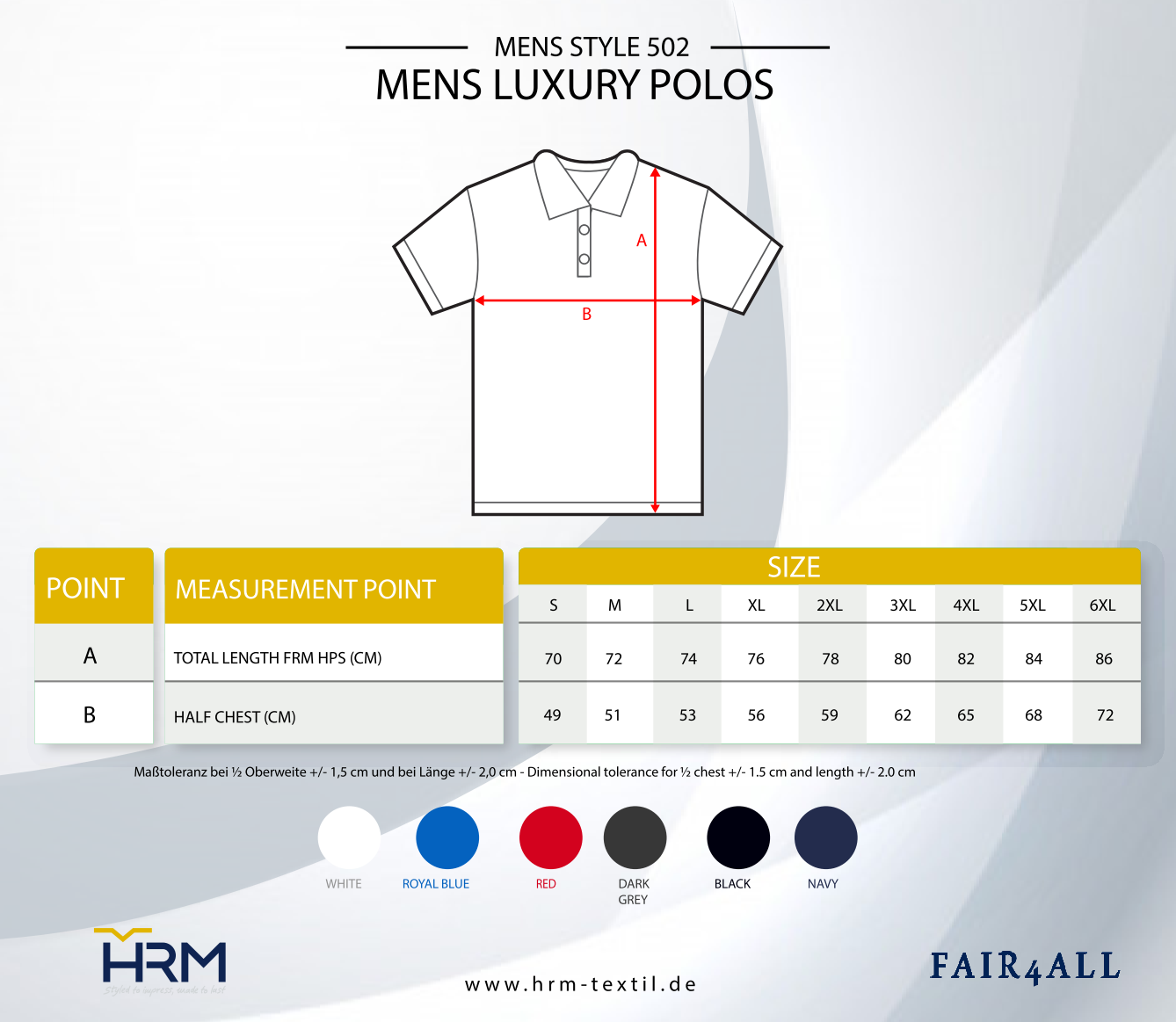 Unsere HRM Herren Luxury Stretch Poloshirts mit der innovativen Kragenverarbeitung bestehen aus 95 % Baumwolle und 5 % Elastan-Ringspinn-Piqué und haben einen modischen, figurbetonten Schnitt mit einer Ton-in-Ton-3-Knopfleiste von HRM Einzelheiten. Twillbandverstärkte Seitenschlitze und das Twill-Nackenband sorgen für einen tollen Tragekomfort und eine lange Haltbarkeit. Durch die Anti-Schrumpf- und Anti-Pilling-Behandlung sind sie besonders pflegeleicht. Die Luxury Stretch Poloshirts sind, bis auf das gewebte Fair4All Flag-Label in der linken Seitennaht, etikettenfrei. Aufgrund ihres Elasthan-Anteils sind sie besonders im Büro und/oder in der Freizeit sehr angenehm zu tragen.