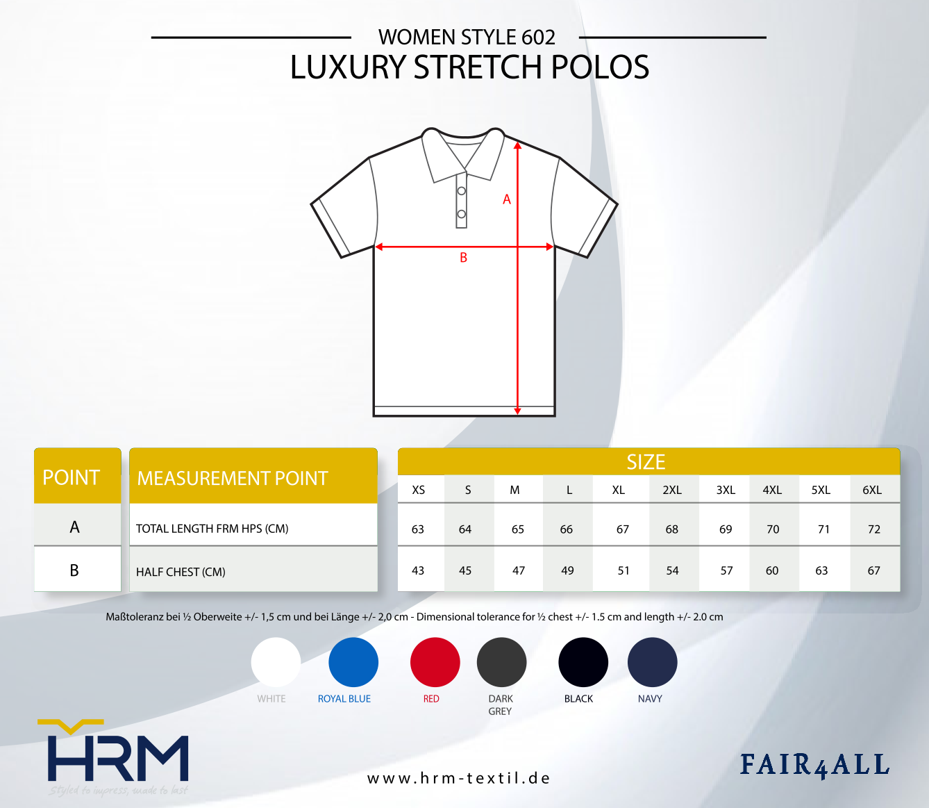 Unsere HRM Women's Luxury Stretch Poloshirts mit der innovativen Kragenverarbeitung bestehen aus 95 % Baumwolle und 5 % Elastan-Ringspinn-Piqué und haben einen modischen, figurbetonten Schnitt mit einer Ton-in-Ton-3-Knopfleiste von HRM Einzelheiten. Twillbandverstärkte Seitenschlitze und das Twill-Nackenband sorgen für einen tollen Tragekomfort und eine lange Haltbarkeit. Durch die Anti-Schrumpf- und Anti-Pilling-Behandlung sind sie besonders pflegeleicht. Die Luxury Stretch Poloshirts sind, bis auf das gewebte Fair4All Flag-Label in der linken Seitennaht, etikettenfrei. Aufgrund ihres Elasthan-Anteils sind sie besonders im Büro und/oder in der Freizeit sehr angenehm zu tragen.