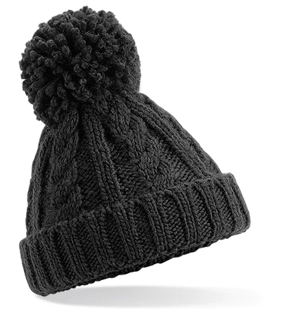 Tear-away Label für einfaches Neulabeln, Schwerer Kabelstrick in Melange, Handgestricktes Griffgefühl, Einfarbige Bommel, Atmungsaktive und komfortable Baumwoll-Jersey-Fütterung, Aufschlagdesign zur optimalen Verzierung