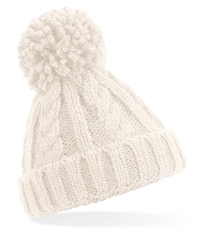 Tear-away Label für einfaches Neulabeln, Schwerer Kabelstrick in Melange, Handgestricktes Griffgefühl, Einfarbige Bommel, Atmungsaktive und komfortable Baumwoll-Jersey-Fütterung, Aufschlagdesign zur optimalen Verzierung