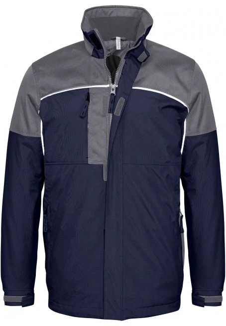 Außen: 100% Polyamid Oxford mit PU-Beschichtung. Innen: Polyester Steppfutter. Wasserdicht 3000 mm. Zipper, unten einstellbar. 3 Fronttaschen mit Reißverschluß. 2 Innentaschen. Innenfleecekragen. Reflektierende Paspeln an Vorder-und Rückseite. Schulterpasse und Seitenverstärkung. Innen-Reißverschlüsse an Brust und Hüfte für leichtes Veredeln.
