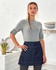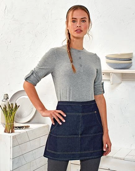 Diese Taillenschürze vereint Funktionalität mit Stil und verfügt über kontrastierende Nähte, die vier Vordertaschen bilden, die praktisch zum Tragen von Zahlungsterminals und Bestellblöcken sind. Krawatten aus gleichem Stoff sind lang genug, um sie zu verdoppeln und an der Vorderseite zu binden, um dem Servicepersonal eine ordentliche und professionelle Uniform zu verleihen.