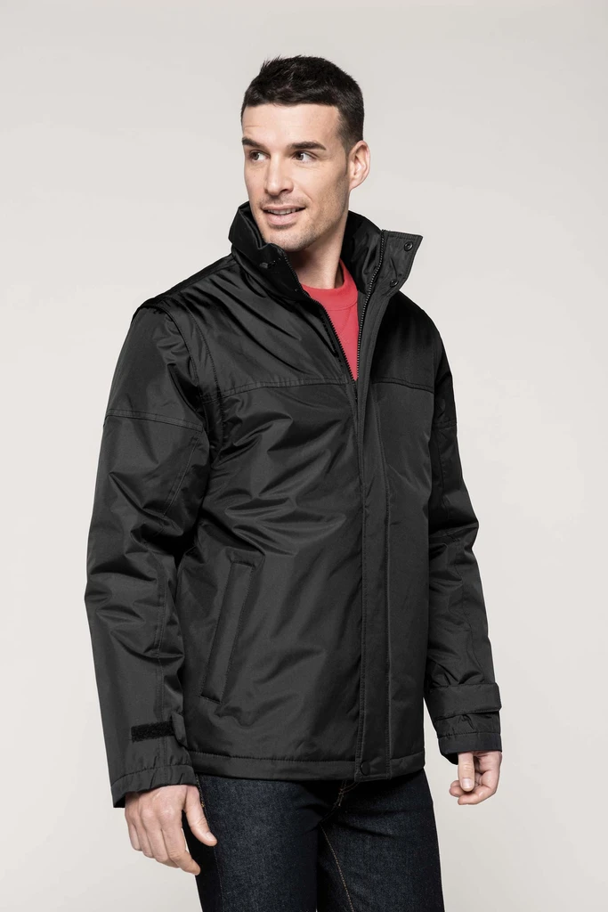 Außen: 100% Polyester PVC-Beschichtung innenseitig. Innenfutter: 100% Polyester und 100% Polyesterwattierung. Reißverschluß + Druckknopfleiste - abtrennbare Ärmel. Armabschluß mit Klettverschluß. 2 Seitentaschen. Kapuze im Kragen mit Reißverschluß. 2 Innentaschen mit Reißverschluß +. 1 Handytasche. Kordelzug mit Stoppern am Bund. Zugang mittels Reißverschluß für leichtes Veredeln.