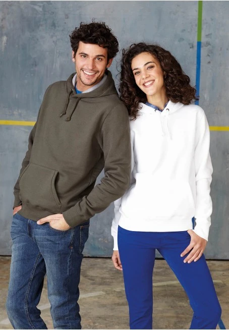 80 % combed cotton / 20 % polyester. Low shrinkage brushed fleece. Silicone wash. Heather grey contrast reinforced neck tape and inner hood for all colours, except for oxford grey body where reinforced neck tape and inner hood are dark grey. Set-in sleeves. Front kangaroo pouch pocket. Ribbed cuffs and waistband.