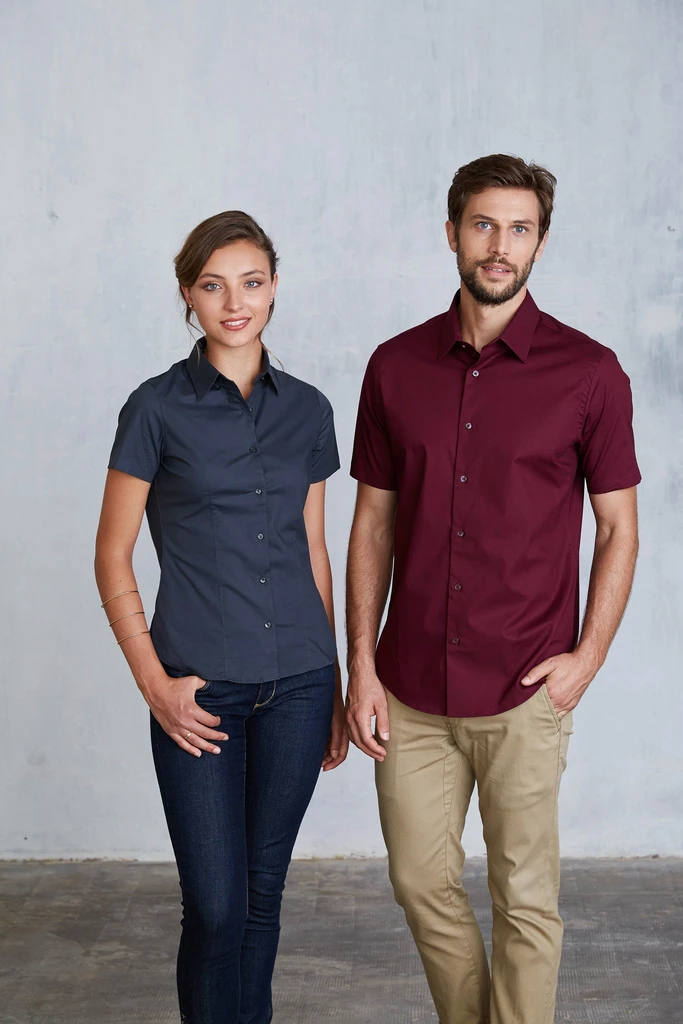 97% Baumwolle 3% Elasthan. Körpernaher Schnitt. Halb ausgestellter, stäbchenverstärkter Kragen. Farblich abgestimmte Knöpfe. Rückwärtige Schulterpasse mit 2 an den Seiten eingelegten Falten. Gefüllter Saum am Ärmelende. 1 Ersatzknopf. Abgerundeter Saum.