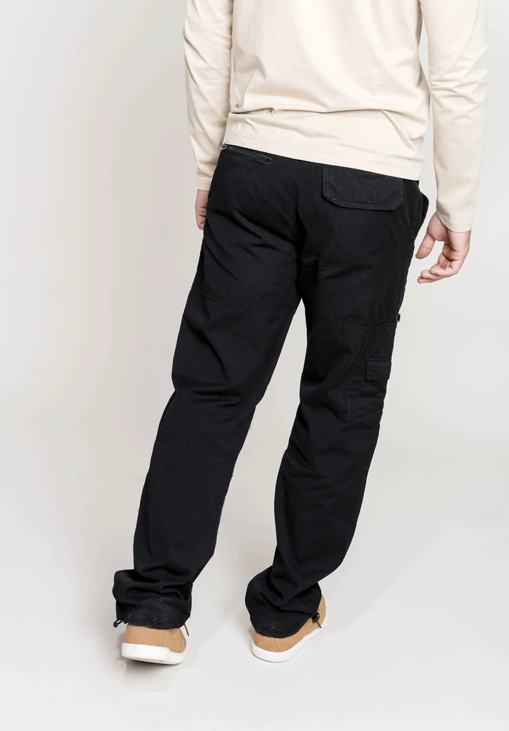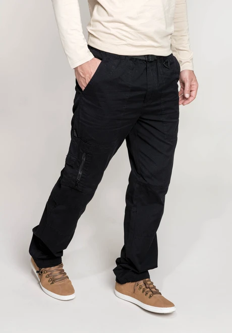 100% gewaschenes Canvas-Baumwollgewebe. 2 Seitentaschen. 3 Beintaschen, 2 mit Reißverschluß und eine mit Klappe. Gürtel und Gummizug am Bund. Kordelzug mit Stoppern am unteren Hosenbein. 2 Taschen auf der Rückseite. Größen im Katalog sind französische Größen.