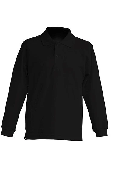 Kinder Polo-Piquee Unisex Shirt, langer Arm, verstärkte Seitenschlitze. Doppelte Nähte an Kragen, Ärmeln und Bund, 2 Knöpfe. Lycra im Ribkragen und Armbündchen, Nackentape Schulter zu Schulter.