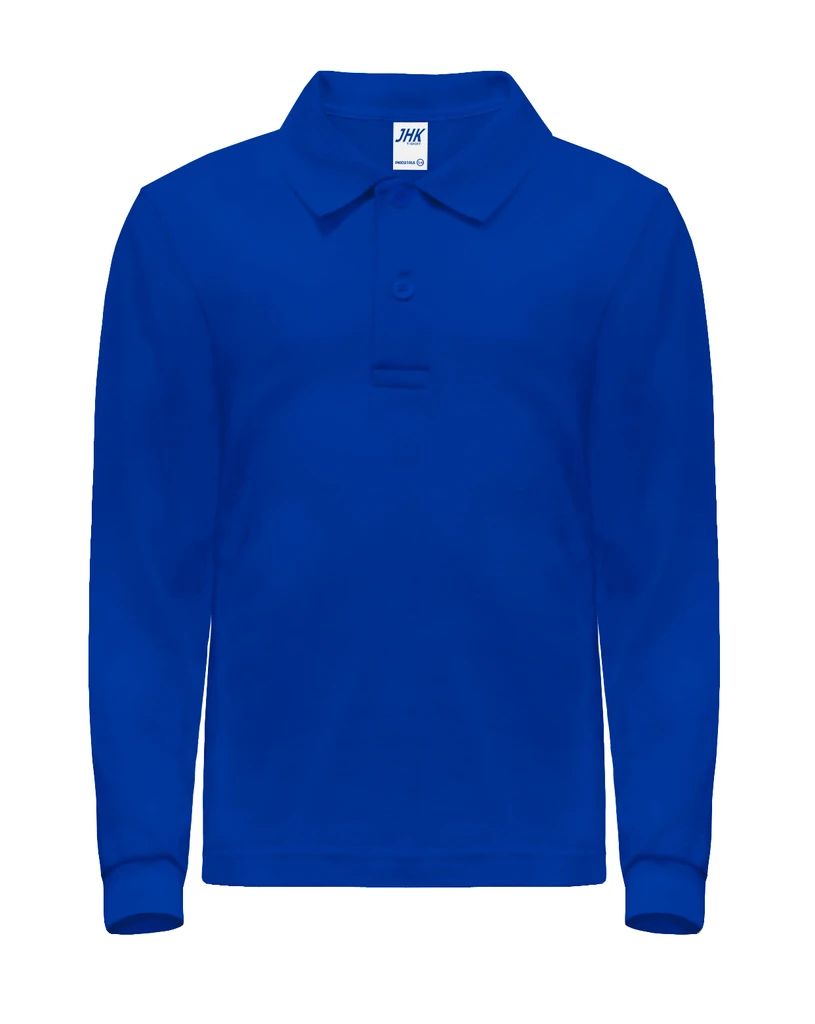 Kinder Polo-Piquee Unisex Shirt, langer Arm, verstärkte Seitenschlitze. Doppelte Nähte an Kragen, Ärmeln und Bund, 2 Knöpfe. Lycra im Ribkragen und Armbündchen, Nackentape Schulter zu Schulter.