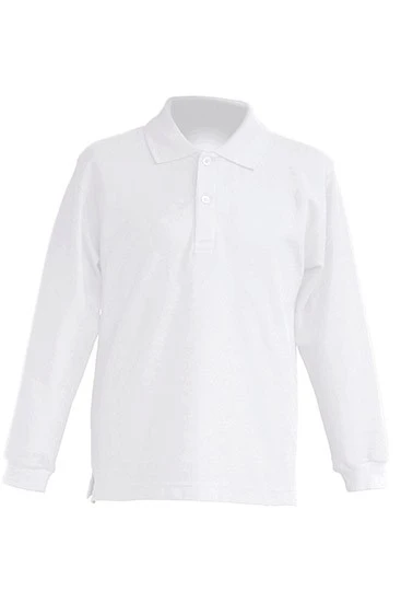 Kinder Polo-Piquee Unisex Shirt, langer Arm, verstärkte Seitenschlitze. Doppelte Nähte an Kragen, Ärmeln und Bund, 2 Knöpfe. Lycra im Ribkragen und Armbündchen, Nackentape Schulter zu Schulter.