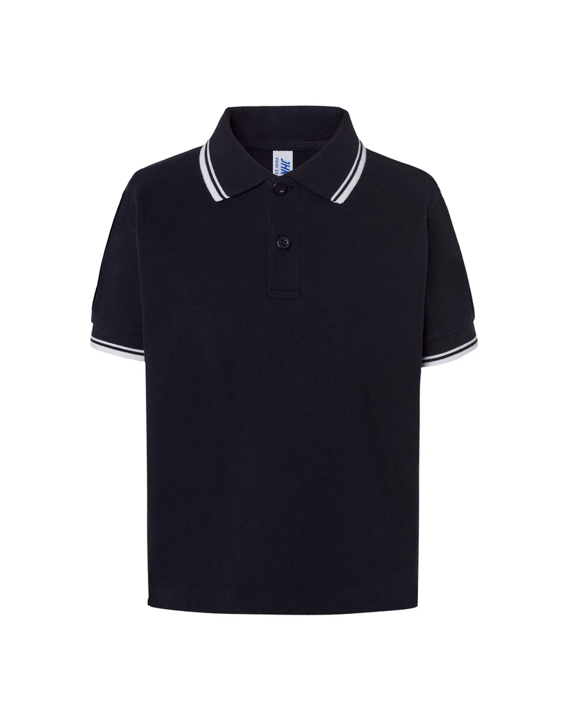 Kinder Unisex Polo-Piquee Shirt, kurzer Arm, verstärkte Seitenschlitze. Doppelte Nähte an Kragen, Ärmeln und Bund, 2 Knöpfe. Lycra im Ribkragen und Armbündchen, Nackentape Schulter zu Schulter.