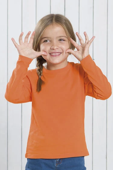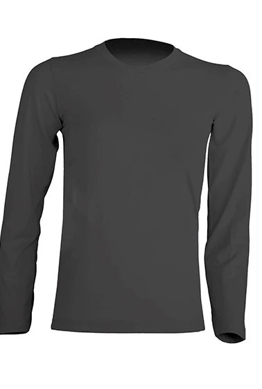 Langärmeliges T-Shirt für Kinder. Seitennähte am Körper. Lycra Rippenhals. Doppelnaht an Kragen, Ärmeln und Boden. Schulter zu Schulter Band. Grey Melange: 85% Baumwolle / 15% Polyester.