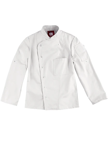 Trendige Kochjacke, für die Damen leicht tailliert, mit praktischen Druckknöpfen, Brusttasche und Ärmeltasche. Die Ärmel können aufgekrempelt und mit Schlaufe und Druckknopf fixiert werden. Eine Rückenfalte sorgt für Bewegungsfreiheit. 95° C waschbar, pflegeleicht, knitterarm, farbecht, industriewäsche- und finishertauglich.