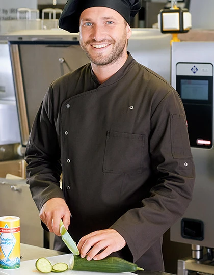 Trendige Kochjacke mit praktischen Druckknöpfen, Brusttasche und Ärmeltasche. Die Ärmel können aufgekrempelt und mit Schlaufe und Druckknopf fixiert werden. Eine Rückenfalte sorgt für Bewegungsfreiheit. 95° C waschbar, pflegeleicht, knitterarm, farbecht, industriewäsche- und finishertauglich.