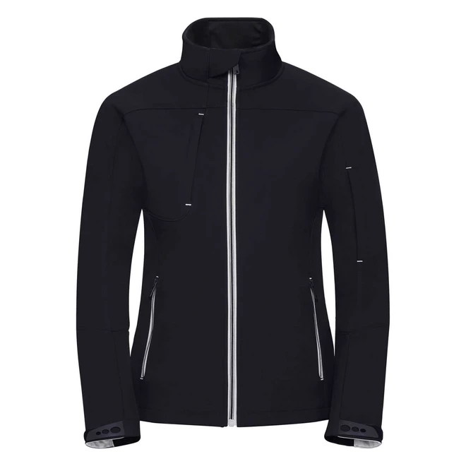 Fluor und PFC frei, Wind- und wasserdicht (5000 mm), Atmungsaktiv (5000 g/m² in 24h), Stehkragen, Hydroshell Air Einsätze im Achselbereich, Brust-, Arm- und Seitentaschen mit Zip, Media-Netztasche innen, Verstellbare Ärmelbündchen, Tailliert, Veredlungszugang: Zip im Innenfutter, Geeignet für Transfer-, Siebdruck oder Prägung. Zertifikate: STANDARD 100 by OEKO-TEX®; WRAP