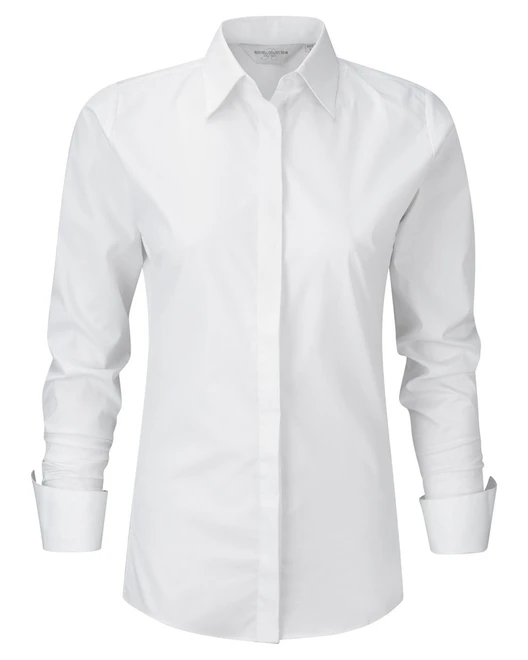 Gewicht: 130 g/m² (white: 125 g/m²); Material: 75% Baumwolle, 25% Elastomultiester-Faser (Lycra® T400®) Popeline; Körperbetonte Ultimate Stretch Bluse – Langarm; Ausgezeichnete Formbeständigkeit für anhaltenden Sitz, Strapazierfähiger Stoff, schnelltrocknend für kühlen Komfort, Schlichter, moderner Kragen, Verdeckte Knopfleiste, Cocktail-Manschetten, Abnäher hinten, Prinzessschnitt (keine Seitennähte), Lycra® Etikett, Körperbetonter Schnitt; Zertifikate: STANDARD 100 by OEKO-TEX®; WRAP