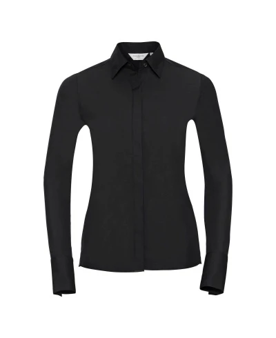 Gewicht: 130 g/m² (white: 125 g/m²); Material: 75% Baumwolle, 25% Elastomultiester-Faser (Lycra® T400®) Popeline; Körperbetonte Ultimate Stretch Bluse – Langarm; Ausgezeichnete Formbeständigkeit für anhaltenden Sitz, Strapazierfähiger Stoff, schnelltrocknend für kühlen Komfort, Schlichter, moderner Kragen, Verdeckte Knopfleiste, Cocktail-Manschetten, Abnäher hinten, Prinzessschnitt (keine Seitennähte), Lycra® Etikett, Körperbetonter Schnitt; Zertifikate: STANDARD 100 by OEKO-TEX®; WRAP