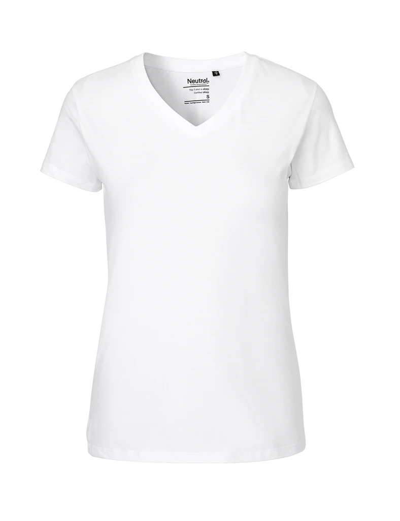 Material: 100% Bio-Fairtrade-Baumwolle, Single Jersey Knit; Gewicht:155 g/m; Leicht tailliert an Schultern und Ärmeln. V-Ausschnitt, Elasthan Rippe gestrickter Nackenbügel. Nackenband, ringgesponnene gekämmte Baumwolle; Gewicht: OEKO-TEX® STANDARD 100, 100% CERTIFIED ORGANIC COTTON, FAIR WEAR, EU ECOLABEL, SA8000, NEUTRAL® RESPONSIBILITY