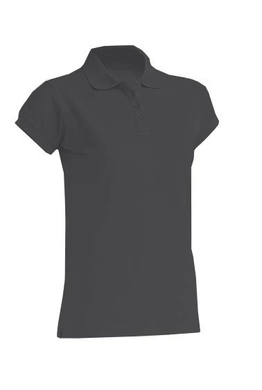 Kurzärmeliges Polo-Shirt für Damen. Körper gepasst. Piqué-Gewebe. Knopfleiste mit drei Knöpfen. 1x1 Rippkragen und Manschetten. Seitenschlitze. Grey Melange: 85% Baumwolle / 15% Polyester.