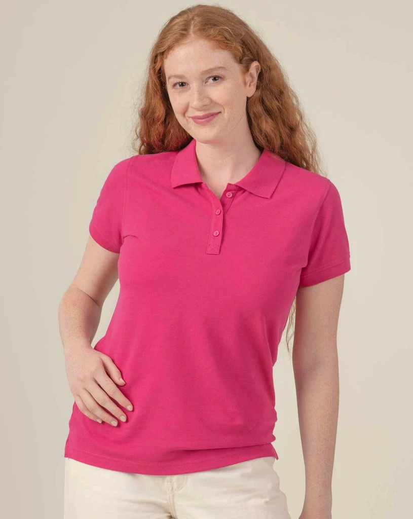 Kurzärmeliges Polo-Shirt für Damen. Körper gepasst. Piqué-Gewebe. Knopfleiste mit drei Knöpfen. 1x1 Rippkragen und Manschetten. Seitenschlitze. Grey Melange: 85% Baumwolle / 15% Polyester.