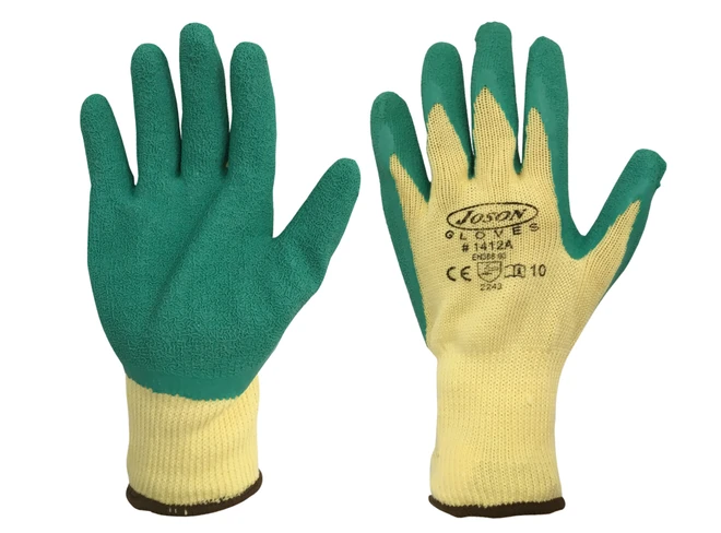 Latex beschichtete Handschuhe, belüfteter Rücken, Strickmanschette, rutschfeste Handinnenfläche, 10 G beschichtete Baumwolle / Polyester; Eigenschaften: weich, stark, widerstandsfähig; Stärken: Komfort, Griff, Präzision, resistent gegen Flüssigkeiten, schnittfest; Einsatzgebiete: Die raue Oberfläche sorgt für eine ausgezeichnete Griffigkeit, auch auf feuchten, rutschigen Oberflächen und schützt vor scharfen Materialien