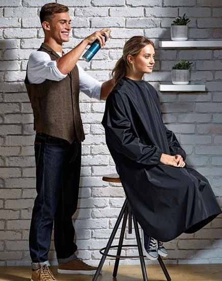 Dieses langärmlige Salonkleid ist eine willkommene Ergänzung unserer wasserdichten Kollektion. Es passt vorne und lässt sich mit einem verstellbaren Klettverschluss sauber um den Nacken schließen. Die langen Ärmel sind mit elastischen Bündchen versehen, die den Kunden Bewegungsfreiheit bieten.
