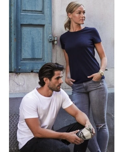 Gewicht: 160 g/m² (White: 155 g/m²; Zusammensetzung: 100% Baumwolle (organisch), gekämmt und ringgesponnen (Light Oxford: 97% Baumwolle, 3% Viskose); Single Jersey, Glatte Oberfläche für optimale Druckergebnisse, Schmaler Kragen mit Elasthan, Schulter-zu-Schulter Nackenband, Leicht umzuetikettieren, Seitennähte, Moderne körpernahe Passform; Zertificate: OEKO-TEX® STANDARD 100, GOTS - Global Organic Textile Standard, WRAP