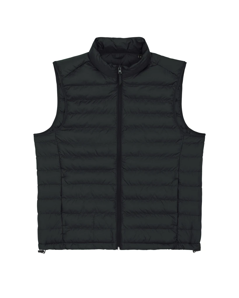 Material: 100 % recyceltes Polyester, fluorfreie DWR; Gewicht: 75g/m²; Taillierter, ärmelloser, hoher Kragen, umgekehrter Nylon-Reißverschluss vorne in der Mitte, Leistentaschen mit Reißverschluss und zusätzlichem Grosgrain-Puller, elastisches Band am Armloch, vollständig gesteppt, Seiteneinsätze für eine bessere Form, innen eingefasste Nähte, unterer Saum mit verstellbarem Kunststoffstopper und elastischer Kordel; Zertifikate: Global Recycled Standard (GRS), Fair Wair, STANDARD 100 by OEKO-TEX®, Peta - Approved VEGAN