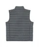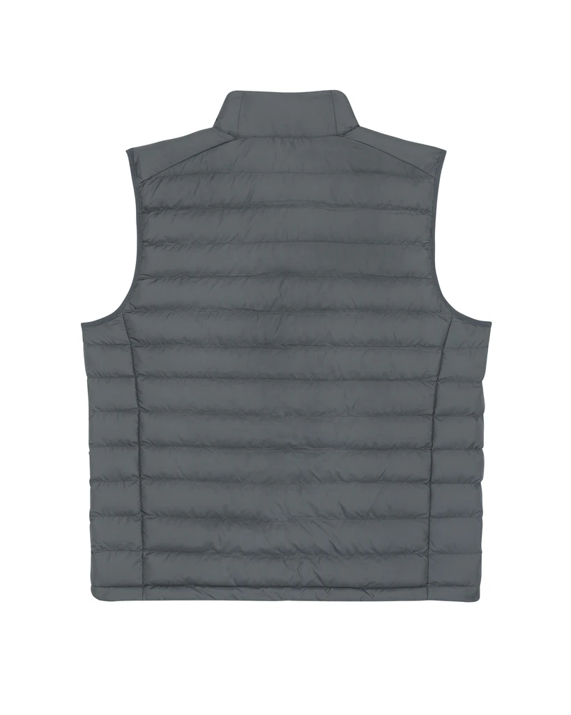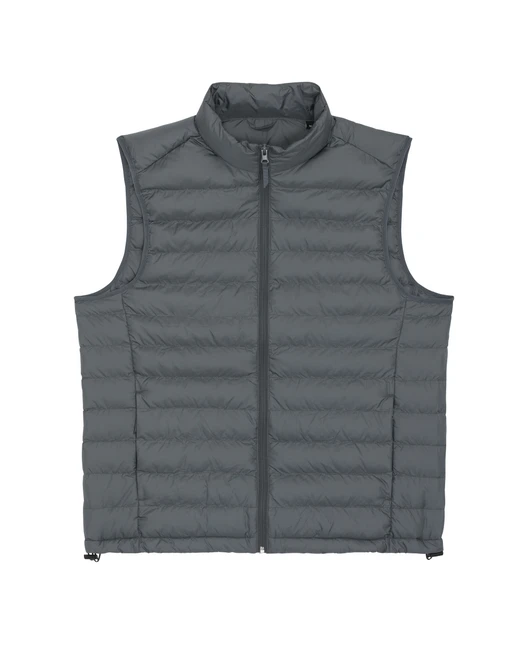 Material: 100 % recyceltes Polyester, fluorfreie DWR; Gewicht: 75g/m²; Taillierter, ärmelloser, hoher Kragen, umgekehrter Nylon-Reißverschluss vorne in der Mitte, Leistentaschen mit Reißverschluss und zusätzlichem Grosgrain-Puller, elastisches Band am Armloch, vollständig gesteppt, Seiteneinsätze für eine bessere Form, innen eingefasste Nähte, unterer Saum mit verstellbarem Kunststoffstopper und elastischer Kordel; Zertifikate: Global Recycled Standard (GRS), Fair Wair, STANDARD 100 by OEKO-TEX®, Peta - Approved VEGAN