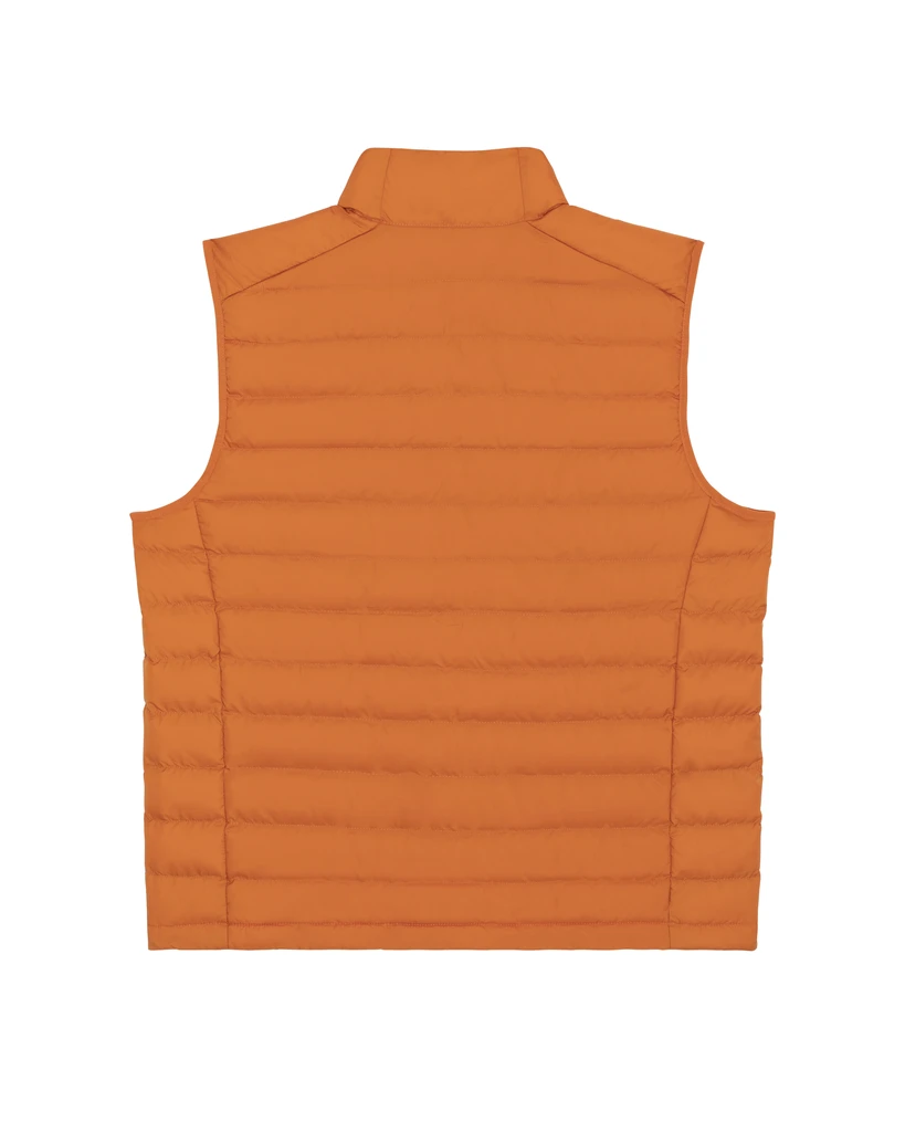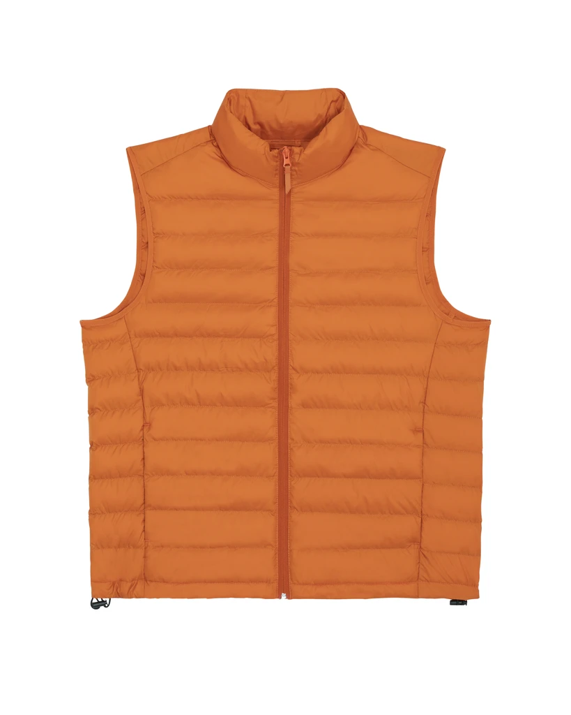 Material: 100 % recyceltes Polyester, fluorfreie DWR; Gewicht: 75g/m²; Taillierter, ärmelloser, hoher Kragen, umgekehrter Nylon-Reißverschluss vorne in der Mitte, Leistentaschen mit Reißverschluss und zusätzlichem Grosgrain-Puller, elastisches Band am Armloch, vollständig gesteppt, Seiteneinsätze für eine bessere Form, innen eingefasste Nähte, unterer Saum mit verstellbarem Kunststoffstopper und elastischer Kordel; Zertifikate: Global Recycled Standard (GRS), Fair Wair, STANDARD 100 by OEKO-TEX®, Peta - Approved VEGAN