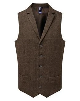 Eine attraktive, vielseitige Weste für Herren. Ausgestattet mit einem Reverskragen, der in den Hauptteil der Weste übergeht, mit Fünf-Knopf-Verschluss. Das Fischgrätenmuster entsteht durch die Verflechtung zweier farbiger Garne. Diese Weste ist an der Unterseite und an der Rückseite vollständig gefüttert, wo sich eine Schnalle befindet, die der Träger entsprechend anpassen kann.