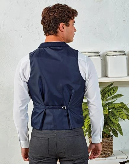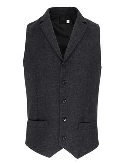 Eine attraktive, vielseitige Weste für Herren. Ausgestattet mit einem Reverskragen, der in den Hauptteil der Weste übergeht, mit Fünf-Knopf-Verschluss. Das Fischgrätenmuster entsteht durch die Verflechtung zweier farbiger Garne. Diese Weste ist an der Unterseite und an der Rückseite vollständig gefüttert, wo sich eine Schnalle befindet, die der Träger entsprechend anpassen kann.