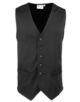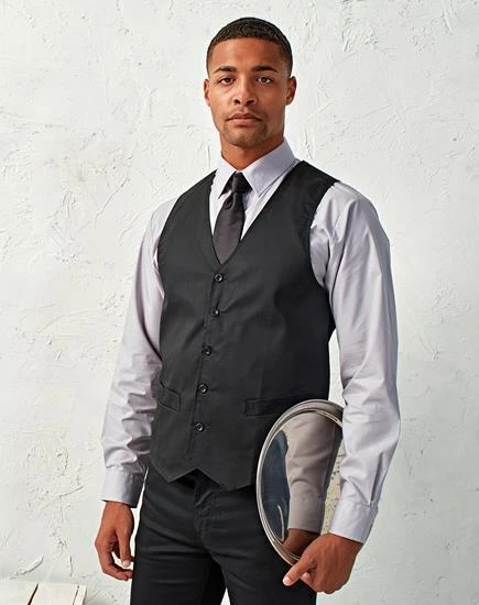 Eine Herren-Hospitality-Weste mit Fünf-Knopf-Verschluss und zwei funktionellen Uhrentaschen. Diese Weste eignet sich hervorragend für diejenigen, die eine elegantere und formellere Herangehensweise an Dienstuniformen wünschen, und sieht mit einem Premier-Hemd und einer Krawatte großartig aus.