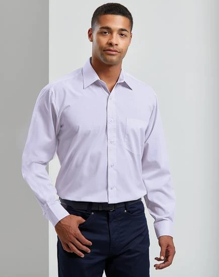 Ein langärmliges Popeline-Hemd für Herren, erhältlich in 27 Farben. Dieses klassische Arbeitshemd hat einen versteiften, formellen Kragen und eine offene Gehrungstasche auf der linken Brust. Der langärmlige Stil hat geknöpfte Manschetten,