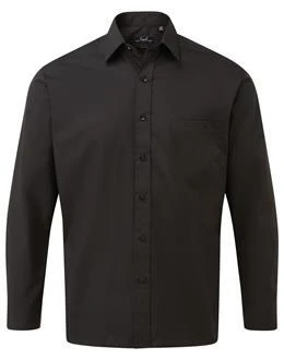 Ein langärmliges Popeline-Hemd für Herren, erhältlich in 27 Farben. Dieses klassische Arbeitshemd hat einen versteiften, formellen Kragen und eine offene Gehrungstasche auf der linken Brust. Der langärmlige Stil hat geknöpfte Manschetten,