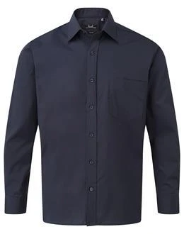 Ein langärmliges Popeline-Hemd für Herren, erhältlich in 27 Farben. Dieses klassische Arbeitshemd hat einen versteiften, formellen Kragen und eine offene Gehrungstasche auf der linken Brust. Der langärmlige Stil hat geknöpfte Manschetten,