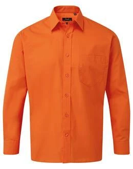 Ein langärmliges Popeline-Hemd für Herren, erhältlich in 27 Farben. Dieses klassische Arbeitshemd hat einen versteiften, formellen Kragen und eine offene Gehrungstasche auf der linken Brust. Der langärmlige Stil hat geknöpfte Manschetten,