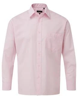 Ein langärmliges Popeline-Hemd für Herren, erhältlich in 27 Farben. Dieses klassische Arbeitshemd hat einen versteiften, formellen Kragen und eine offene Gehrungstasche auf der linken Brust. Der langärmlige Stil hat geknöpfte Manschetten,