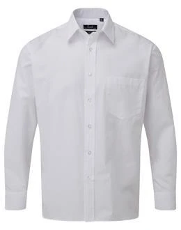 Ein langärmliges Popeline-Hemd für Herren, erhältlich in 27 Farben. Dieses klassische Arbeitshemd hat einen versteiften, formellen Kragen und eine offene Gehrungstasche auf der linken Brust. Der langärmlige Stil hat geknöpfte Manschetten,