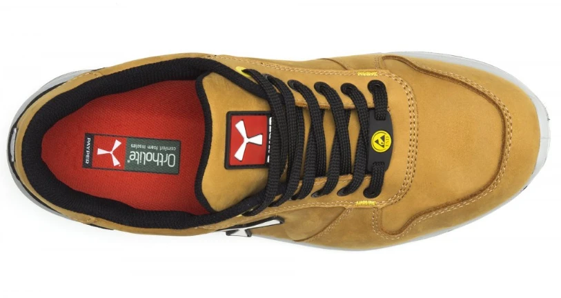 Niedriger Herren-Sicherheitsschuh, Obermaterial aus wasserabweisendem und atmungsaktivem Leder, atmungsaktives und abriebfestes Innenfutter (auf der gesamten Innenfläche), 6+6 metallfreie Ösen, Hinterkappe aus Leder mit Pampasstruktur mit reflektierendem Einsatz, Zehenschutzkappe aus druckgegossenem Aluminium, herausnehmbare Einlage Ortholite X40 016 ESD, zertifizierte durchtrittsichere Sohle aus Verbundgewebe, Versteifungselement zum Schutz vor Verdrehungen, hufeisenförmiger Spitzenschutz, Zwischensohle aus federleichtem Polyurethan ESD, Dämpfungssystem MASTER BALANCE aus PU-Polyether von hoher Bruchfestigkeit und ausgewogener Dichte, X-TRAIL-GRIP-Sohle aus TPU ESD mit Fersen- und Zehenschutz