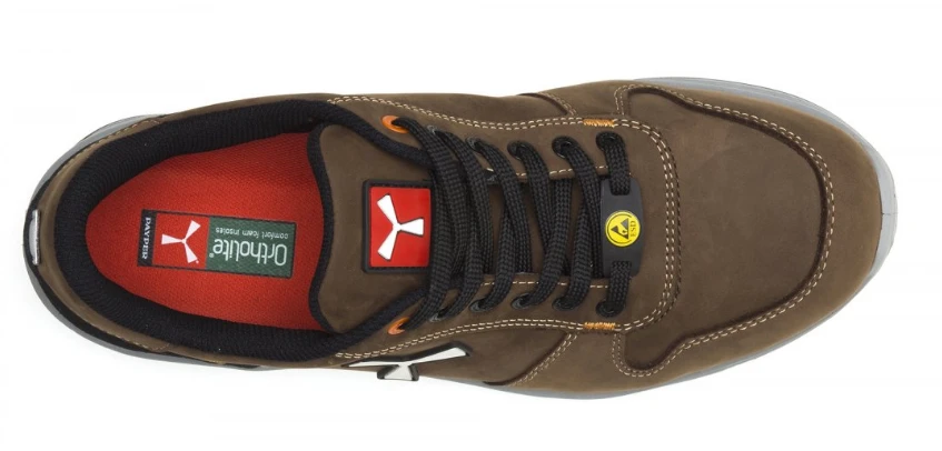 Niedriger Herren-Sicherheitsschuh, Obermaterial aus wasserabweisendem und atmungsaktivem Leder, atmungsaktives und abriebfestes Innenfutter (auf der gesamten Innenfläche), 6+6 metallfreie Ösen, Hinterkappe aus Leder mit Pampasstruktur mit reflektierendem Einsatz, Zehenschutzkappe aus druckgegossenem Aluminium, herausnehmbare Einlage Ortholite X40 016 ESD, zertifizierte durchtrittsichere Sohle aus Verbundgewebe, Versteifungselement zum Schutz vor Verdrehungen, hufeisenförmiger Spitzenschutz, Zwischensohle aus federleichtem Polyurethan ESD, Dämpfungssystem MASTER BALANCE aus PU-Polyether von hoher Bruchfestigkeit und ausgewogener Dichte, X-TRAIL-GRIP-Sohle aus TPU ESD mit Fersen- und Zehenschutz