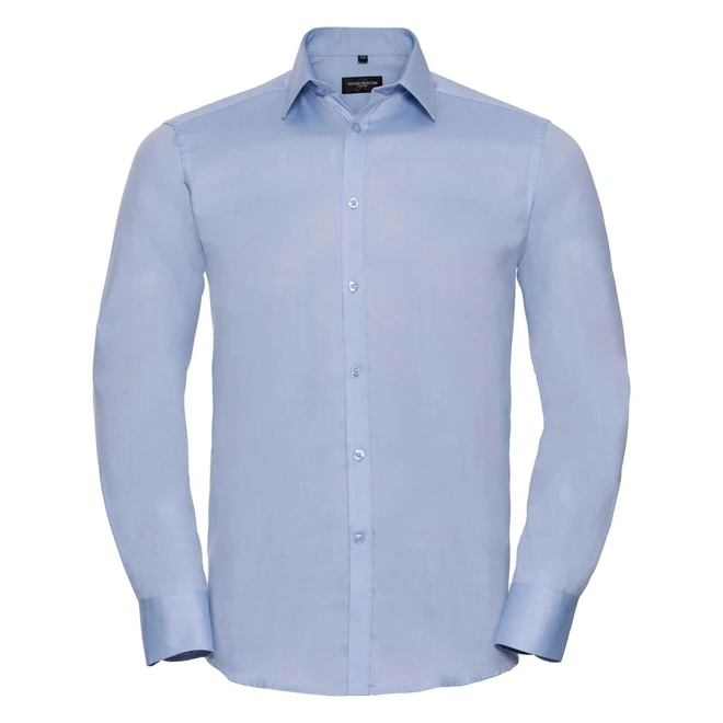 Gewicht: 130 g/m² (White: 125 g/m² ); Material: 84% Baumwolle, 16% Polyester (dezentes Fischgrätmuster); Tailliertes Herringbone Hemd – Langarm; Undurchsichtiger, klassischer Bekleidungsstoff, Halber Cutaway-Kragen, kurze Kragenform, Schmale Knopfleiste