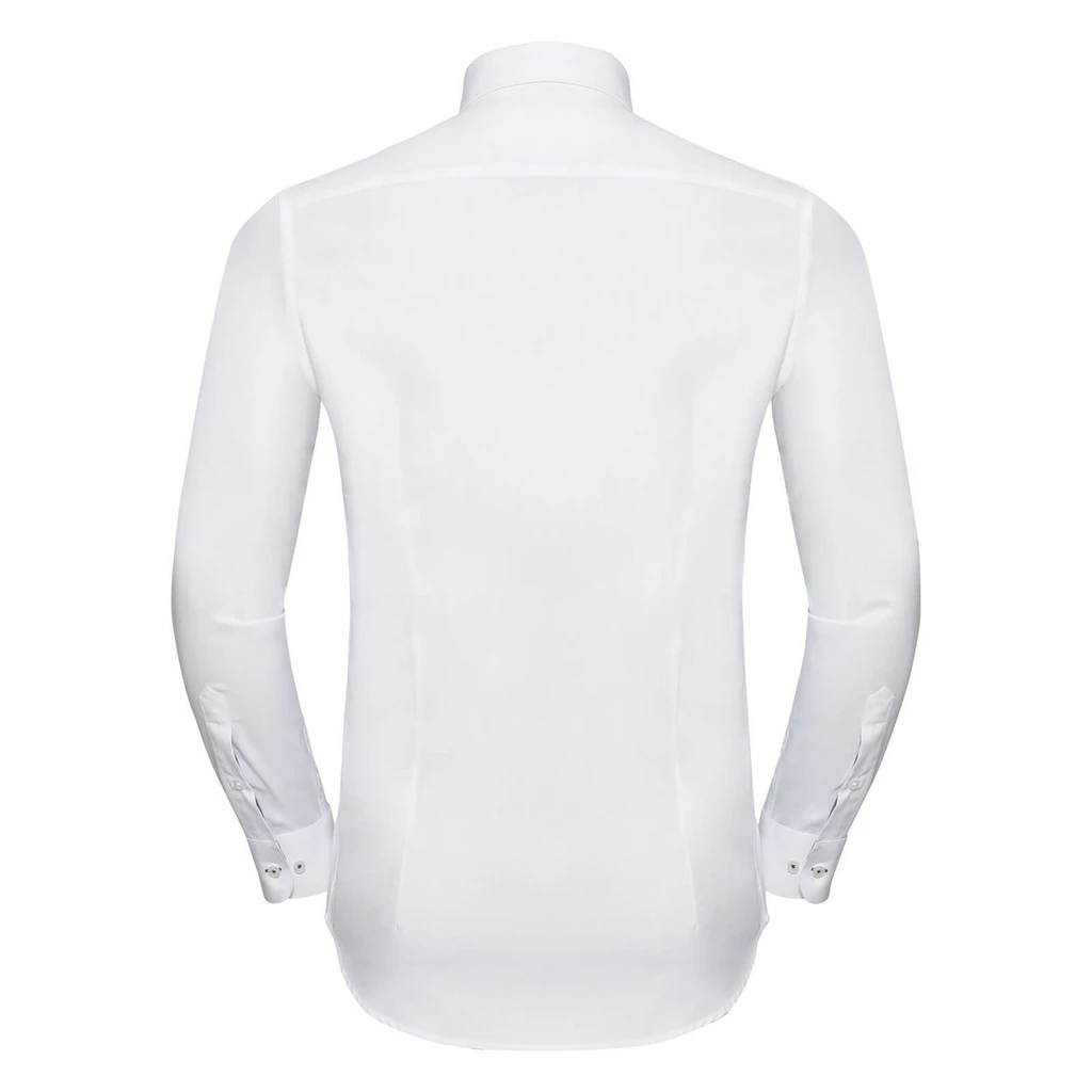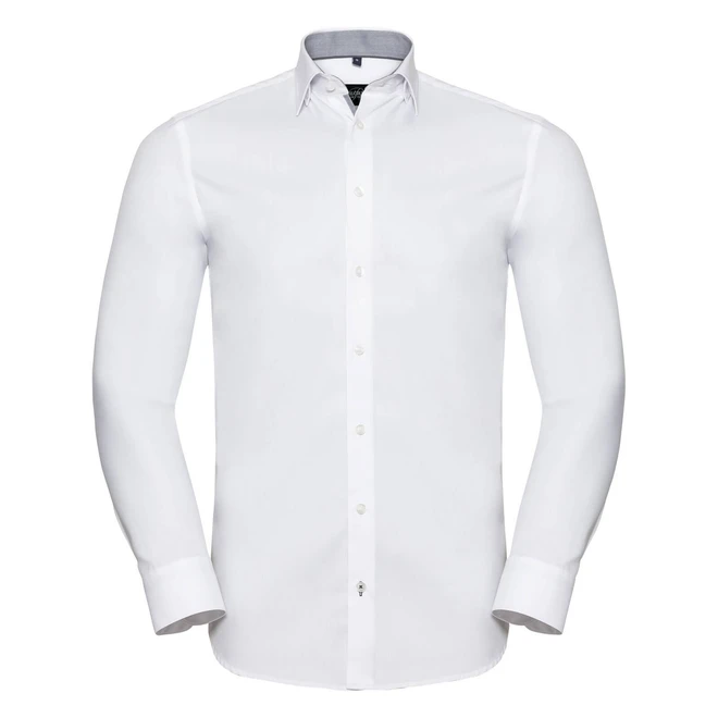 Gewicht: 130 g/m² (Weiß: 125 g/m²); Material: 84% Baumwolle, 16% Polyester; Tailliertes Herringbone Kontrast-Hemd – Langarm; Verdeckter Button-Down-Kragen, Kontrastfarben an Kragen- und Manschetteninnenseite mit Kontrastpaspel, Kontrastkante an der unteren Knopfleiste, Abnäher hinten, Mit 2 Knöpfen verstellbare abgerundete Manschetten (mit Manschettenknöpfen tragbar, Abgerundeter Saum, Pflegeleicht (Easy Care), Körperbetont. Zertifikate: STANDARD 100 by OEKO-TEX®; WRAP