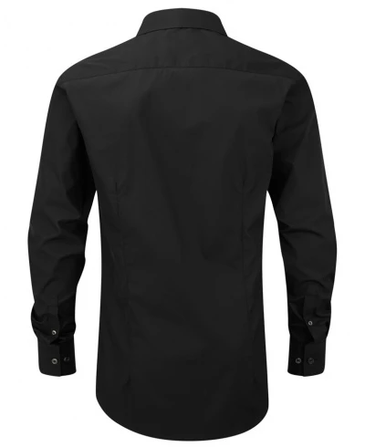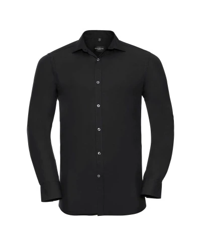 Gewicht: 130 g/m² (white: 125 g/m²); Material: 75% Baumwolle, 25% Elastomultiester-Faser (Lycra® T400®) Popeline; Ausgezeichnete Formbeständigkeit für anhaltenden Sitz, Strapazierfähiger Stoff, schnelltrocknend für kühlen Komfort, Halber Cutaway-Kragen, kurze Kragenform, Schmale Knopfleiste, Eckige Manschetten (mit Manschettenknöpfen tragbar), Abnäher hinten, Körperbetonter Schnitt; Zertifikate: STANDARD 100 by OEKO-TEX®; WRAP