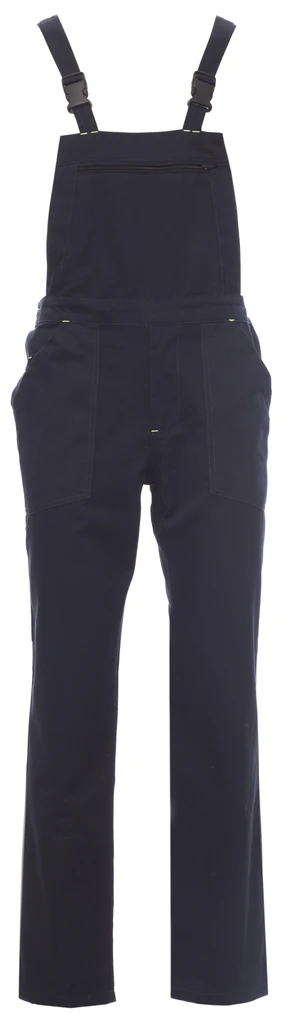 Lätzchen mit ausgiebigem Nierenschutz, elastische Hosenträger und Schnalle mit Druckknopfverschluss, seitliche Öffnung mit Knöpfen und Laschenverschluss mit Reißverschluss, elastischer Bund. Doppelte Nähte im Schritt und im Bein. Brusttasche mit Ausweis- und Reißverschluss, zwei Fronttaschen und Stiftehaltertasche, rechtsseitige Maßbandtasche und eine Gesäßtasche mit Klappe und Klettverschluss