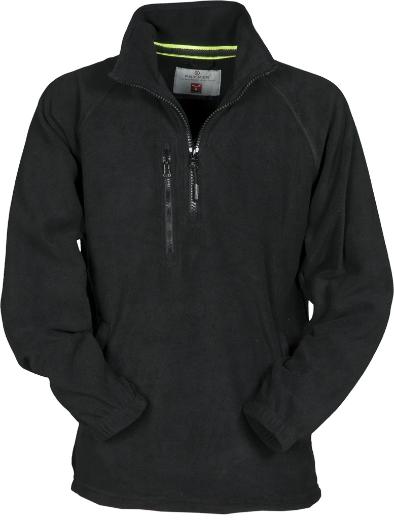Fleecepullover mit kurzem, schwarzem 8 mm Reißverschluss aus Kunststoff, Raglanärmeln, regulierbarem Kordelzug in der Taille, elastischen Ärmelbündchen, zwei Taschen mit verdecktem Reißverschluss, einer Vordertasche mit Reißverschluss, Kragen mit verstärktem Rand in Kontrastfarbe, verstärkten Nähten